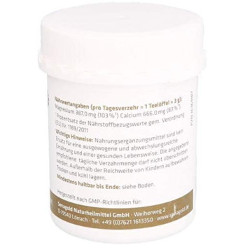 Nährwertangaben: pro empfohlene Verzehrmenge (1 Teelöffel = 3 g) Magnesium 360,0 mg (96% *) Calcium 660,0 mg (83% *) * Prozent der empfohlenen Tagesdosis lt. NKV neu